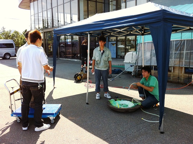そして次の日,朝から外にテントを張って圧力釜で圧を掛けながら焼きます.