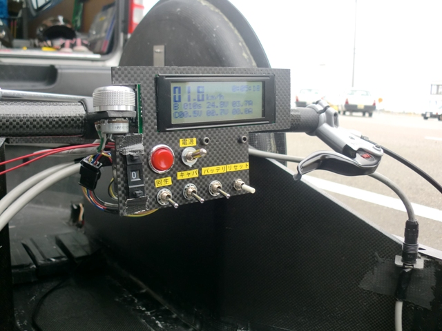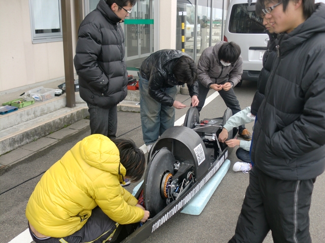 これは昨年度から使っているスパッツを取り付けている様子です。EVはとにかくバッテリとモータを繋ぐだけで走るので、エンジンと比べて準備の時間も荷物もかなり少ないです。