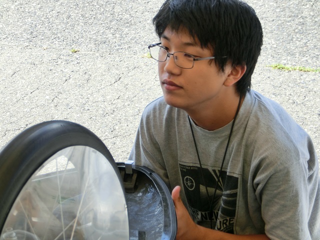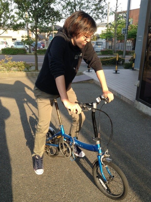 大会メンバーの蘇田君が,山岸技師から頂いた外車ならぬ外チャ(自転車の銘柄に某外車メーカーの名前があったので外チャという名前になった)を嬉しそうに乗っています.
