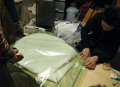 張り込みが完了したら、プリプレグの上からリリースフィルムとピールクロスを敷いていきます。