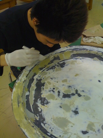 この型にカーボンファイバーとグラスファイバーを張り込みます。