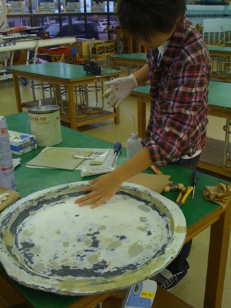 ヘラを巧みに使って、型の凹凸を無くしていきます。