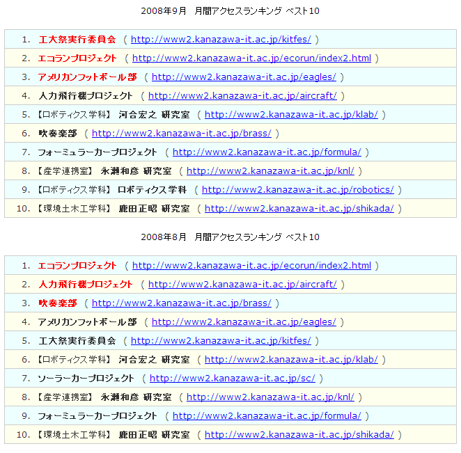 このウェブサイトはKITの共有サーバ上で運営しているのですが、共有サーバに登録されているサイトのアクセスランキングが公開されたみたいなので、勝手にリンクしときます。
