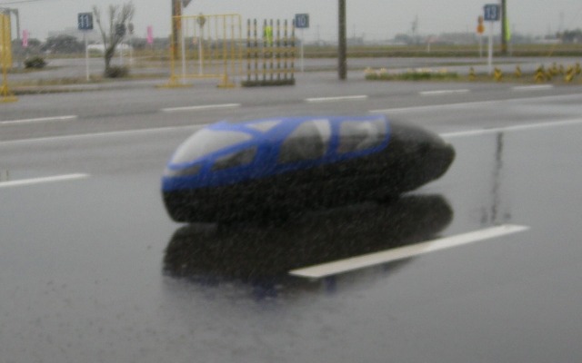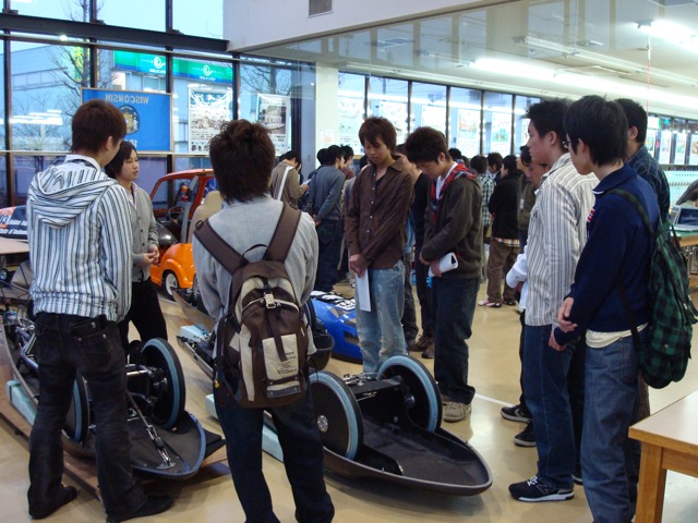 その後は夢考房41号館前で試験走行です。見極めの様子を見ていたフォーミュラカープロジェクトの面々からは、「なんか気持ち悪いな」「静かすぎ。ぱっと見、動力が何か分からないから不気味だ」とお褒めの言葉をいただきました。。