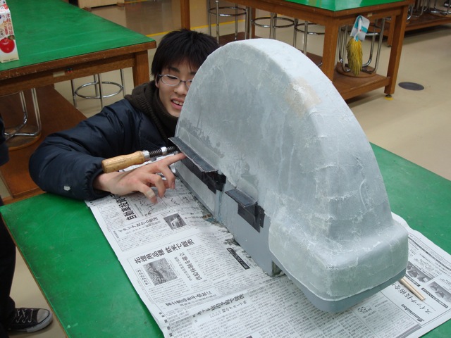こちらは後輪のカバーです。スタイロフォームを成形したものを雄型とし、その上にガラスマットを貼付けたものが製品となります。