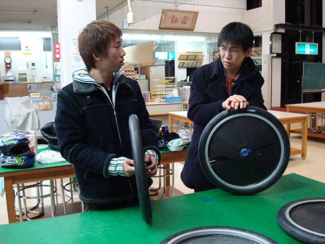 貝瀬氏と岩澤氏です。後輪のブレーキ取り付け箇所のちょっとした補修・補強をしています。