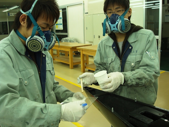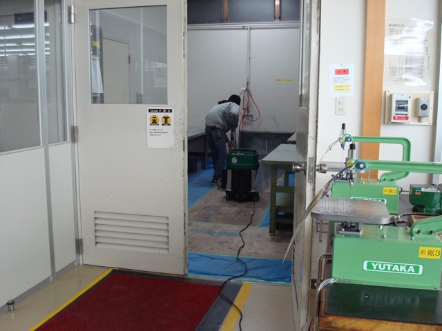 写真は試走出発前に樹脂ブースを清掃する貝瀬氏です。