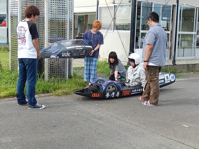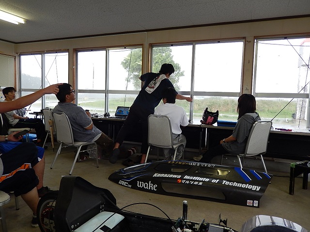 午前中はいい調子で走っていたのですが途中から雨が降って試験を中断しました.夕方ころには晴れてきたので1年生の倉本君に乗ってもらい,wakeに慣れてもらいました.