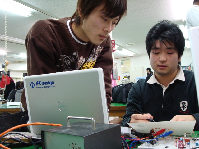 こちらは電装担当、2年生の佐藤翔くんと1年生の仲渡くんです。サーボモーターを見ていました。